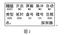 進(jìn)入“系統(tǒng)設(shè)置”界面后,按“1”鍵進(jìn)入“設(shè)備設(shè)置”界面,光標(biāo)在“地址”上,按數(shù)字鍵輸入“0001”地址下的“A000”變?yōu)?ldquo;A001”表示對A001地址的設(shè)備進(jìn)行設(shè)置如下圖2所示: