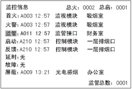 監(jiān)管信息是控制器監(jiān)視的除火災報警、故障信號之外的其他輸入信號。如監(jiān)管模塊、防盜接口等其它各類信號。